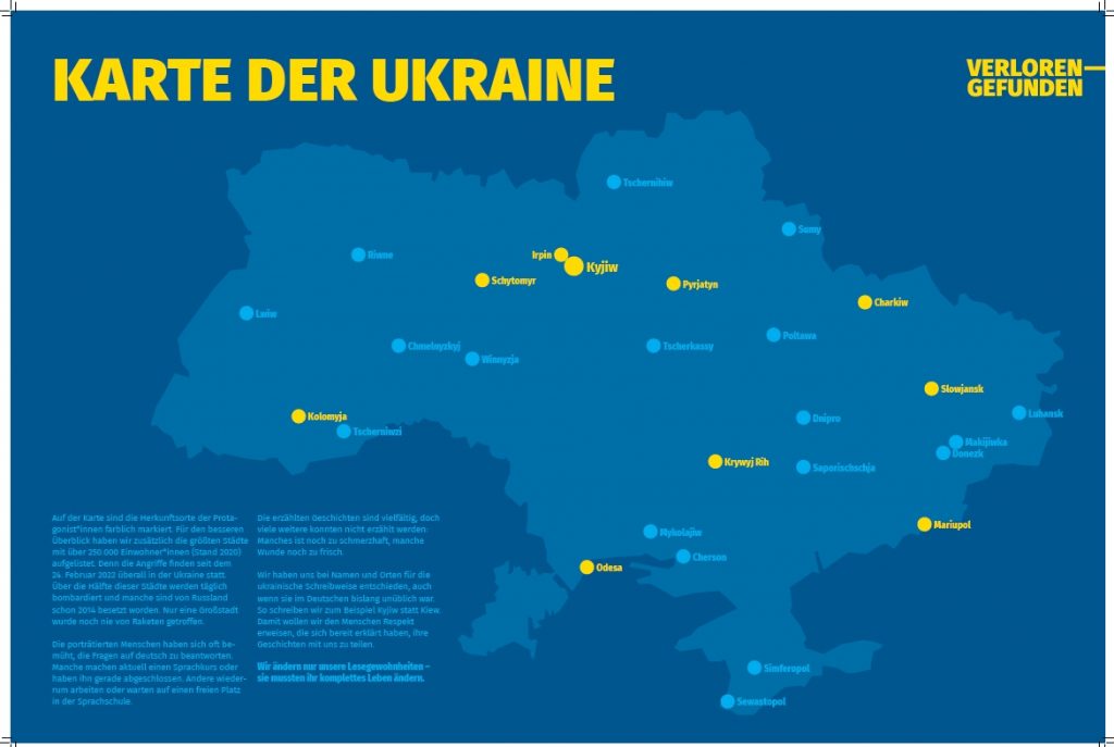 Ми вирішили використовувати український варіант написання власних імен та міст, хоча це досі незвично для німецької мови. Так наприклад, ми використовуємо написання Kyjiw замість Kiew. Таким чином ми хочемо висловити свою повагу до людей, які погодилися поділитися з нами своїми історіями. Нам потрібно лише змінити свої читацькі звички – їм довелося змінити все своє життя.